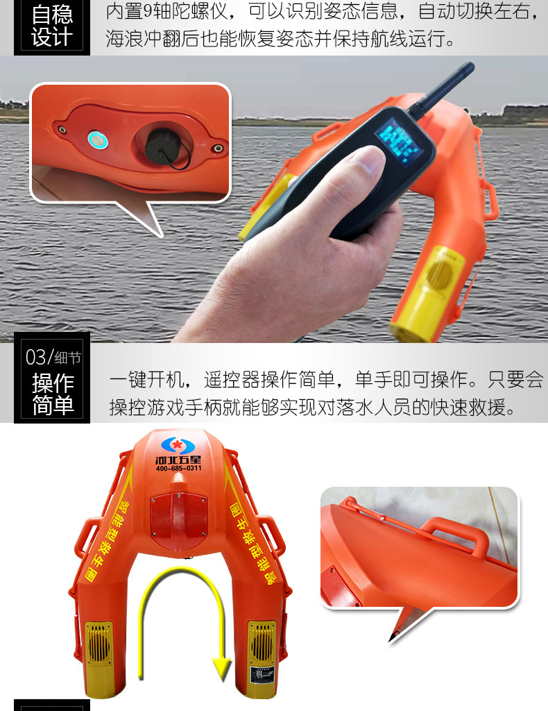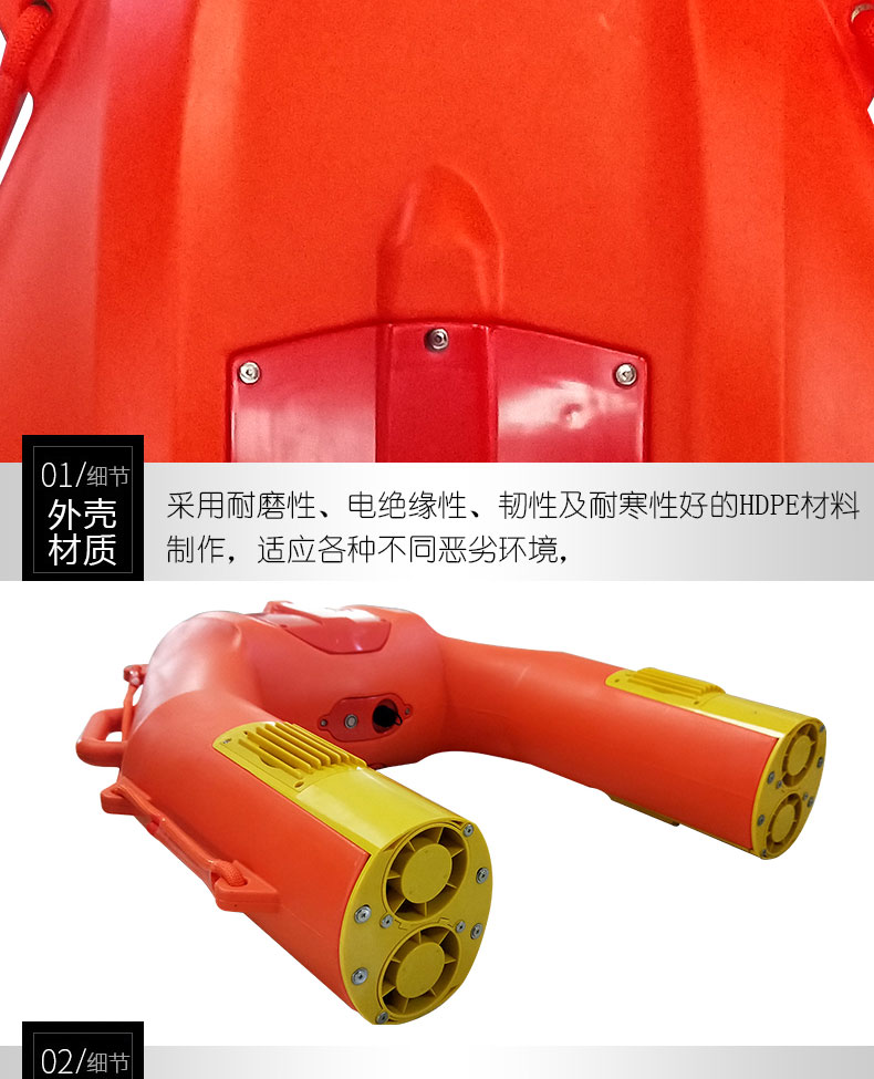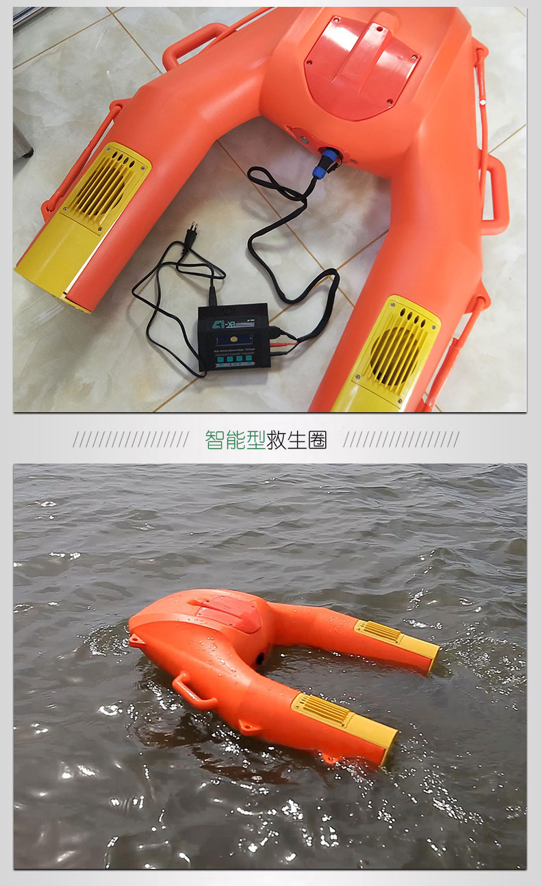 智能遙控救生器,外殼采用耐磨性、電絕緣性、韌性及耐寒性好的HDPE材料制作,適應各種不同惡劣環境,目前搭配的動力系統是安全性很好的鋰電池集成系統,使用安全,內置9軸陀螺儀,可以識別姿態信息,自動切換左右,海浪沖翻后也能恢復姿態并保持航線運行。