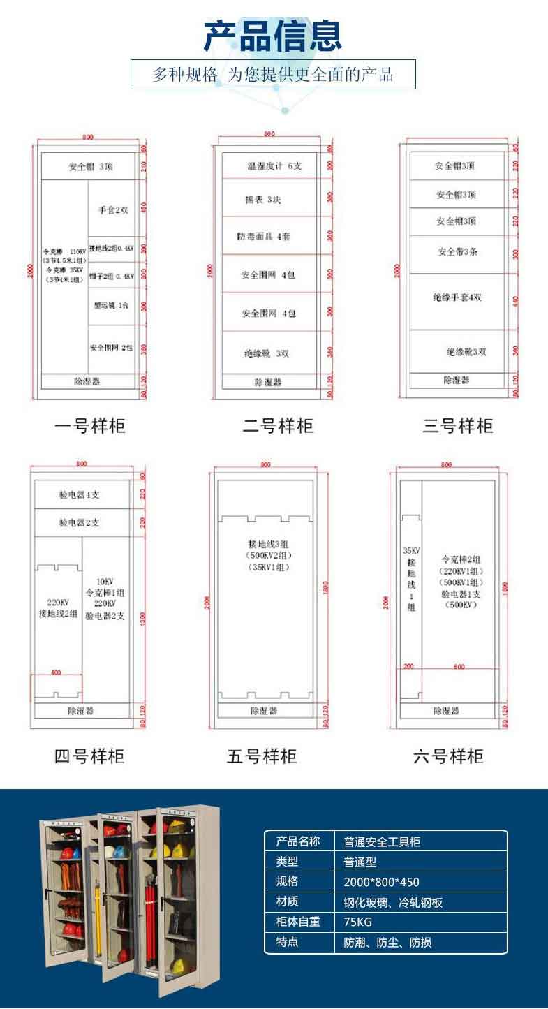 電力安全工具柜又稱安全工器具柜,按功能可以分為普通排風除濕柜,智能烘干除濕柜,智能抽濕除濕柜等 外殼選用1.2優質冷板,采用磷化鋅系、藝術型靜電噴涂,高強度鋼化透明玻璃(外觀色為微機灰)。接地線均配有接地線繞線架及帶夾反光編號牌,使接地線纏繞規范不易損壞,擺放整齊使用方便;絕緣手套配有防粘連撐板,絕緣擋板、絕緣棒、驗電筆、操作桿均設有橡膠墊定位卡,安全帶、腳扣、鑰匙設有專用掛鉤,標示牌按種類分格放置,圍網配有專用包,網桿配有專用筒,網桿座分格放置,防毒面具配有專用箱,呼吸器設有專用滑板。廣泛應用于各種電壓等級的變電站、集控站、線路工區以及電力公司客服中心等單位和部門,并適應不同溫濕度地區的使用。